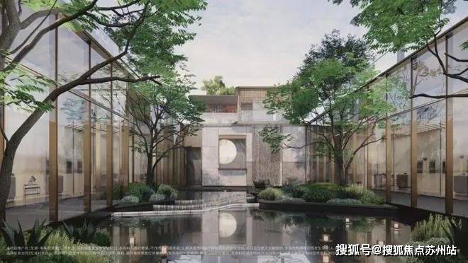 登门入府,约80米跨度城市景墙,宝石般中心水景,打造酒店化精奢前场迎宾礼序;地面铺装转译自苏州市花桂花纹理,约20㎡整面蓝翡翠奢石照壁,延续江南深宅大院的形制。