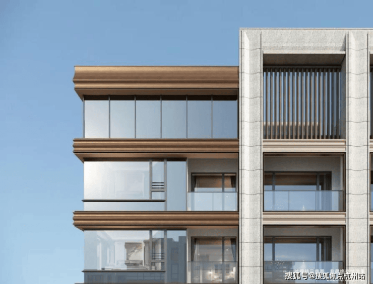 项目可视面都是古铜色金属铝板、米黄色铝板/石材、边套270°大转角飘窗,且从正面、侧面到背面,立面都保持精致统一。