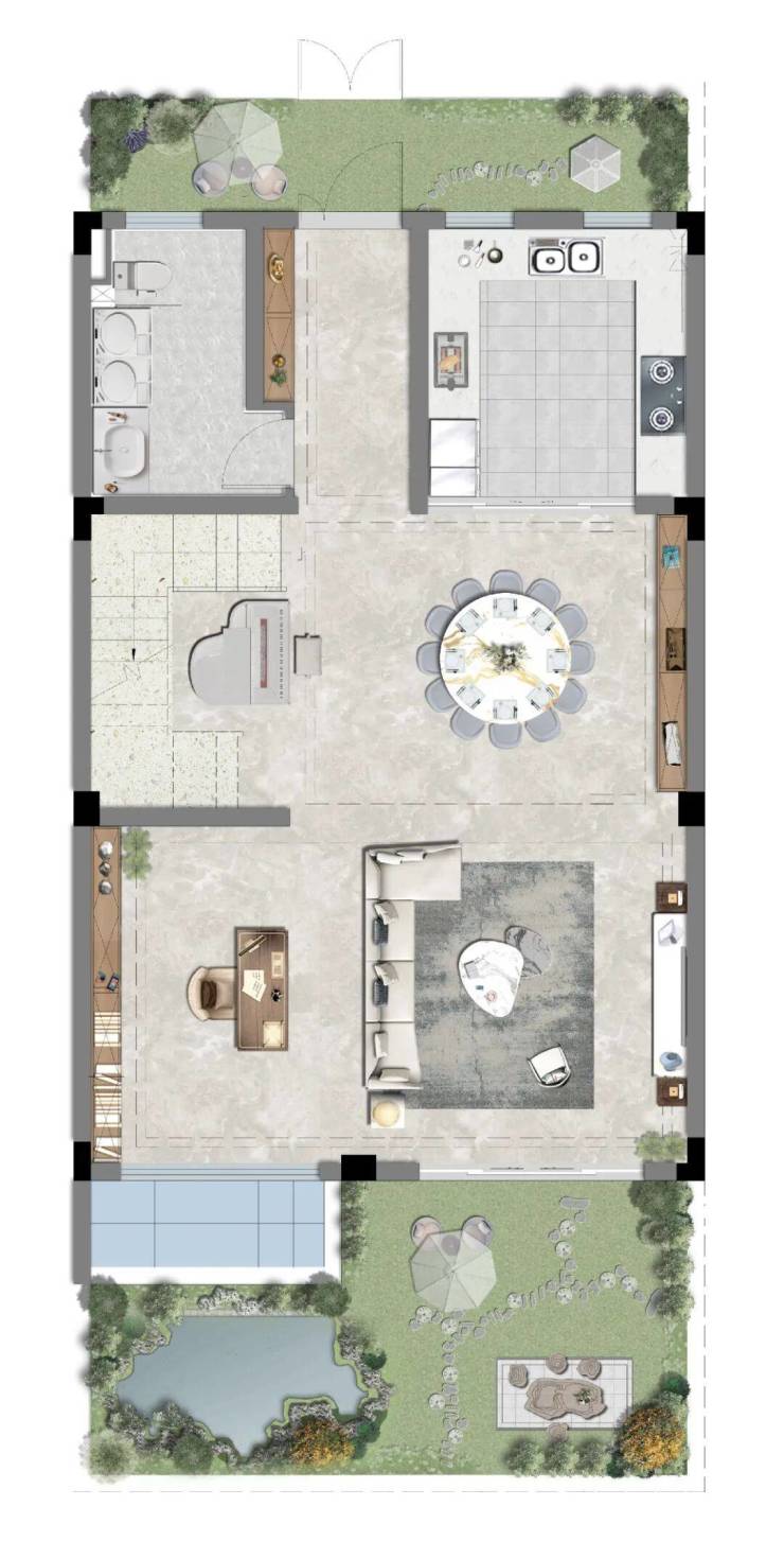 面约197㎡排屋 一层装修示意图,非交付标准。庭院空间仅供展示,实际为小区绿地用途,院内绿化、装修及物品均不属于交付范围。