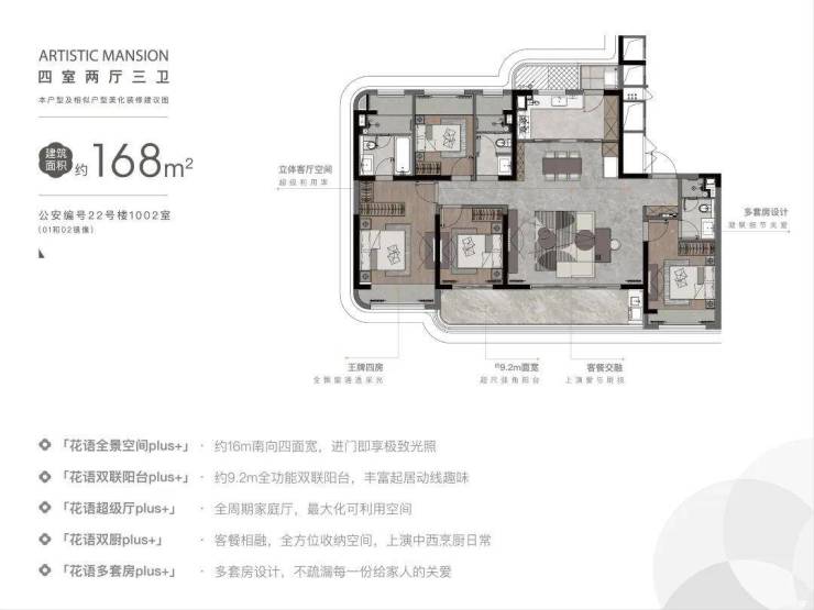 约168㎡ 四房两厅三卫:功能分区明确,尊享三卫便利。