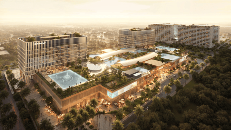 全维配套更是覆盖生活、康养、娱乐全场景:社区自带大型购物中心、大型商超、多元餐饮集群与儿童乐园,步行范围内即可满足日常所需;康养方面,配备泳池、现代化健身房、水上健身房、户外瑜伽/SPA、漂浮休闲舱等设施,低冲击的水上运动与静谧的冥想空间,让健康成为生活常态;娱乐层面,社区圆形剧场、户外影院、弗拉门戈舞台、水幕投影秀等多元业态,为居者与办公人群打造丰富的社交与休闲场景。