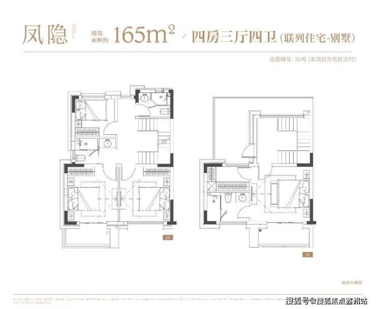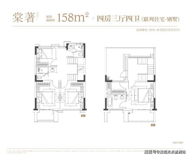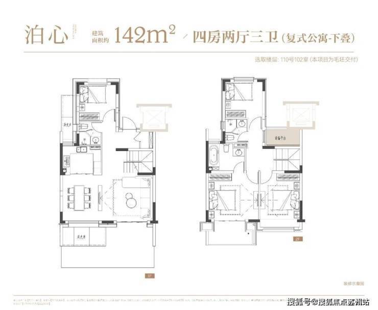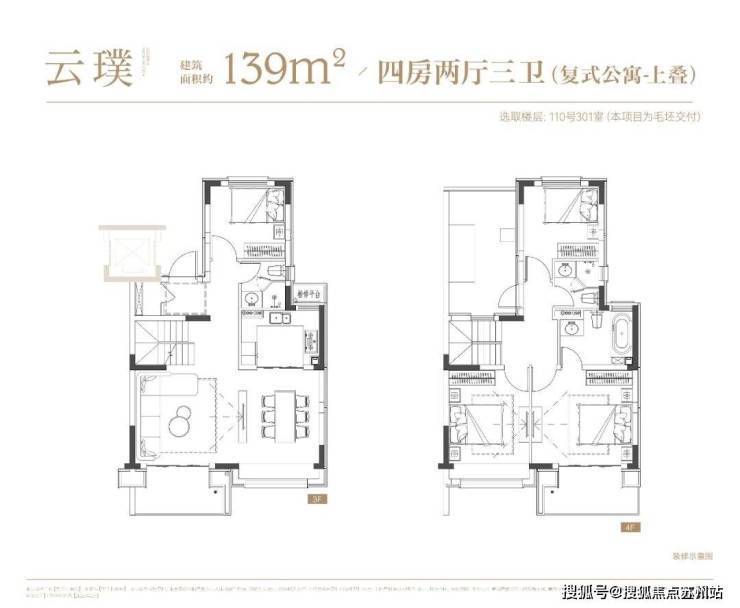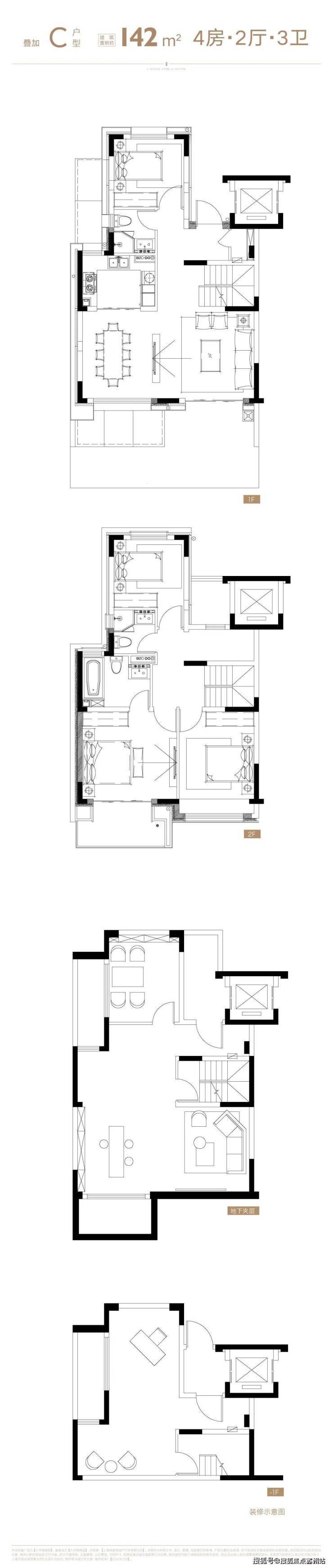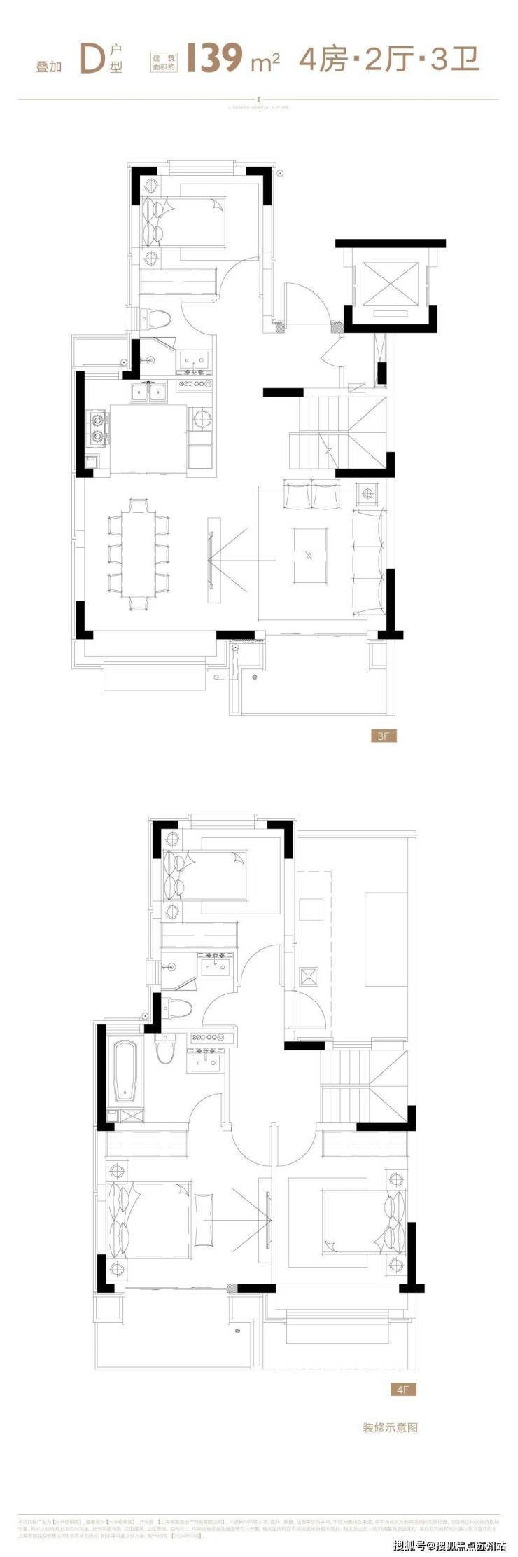 4层叠墅分为上/下叠,上叠建筑面积约139㎡,下叠建筑面积约142㎡,均为4房设计。