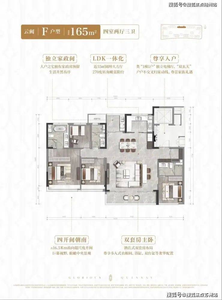 165方四室两厅两卫:6号楼165方是本项目的央景楼王户型,坐落园区中轴之上,270°转角瞰景阳台正对约5000方中心景观,一览无余的视角让自然常驻窗前,整个园区仅有56套,自然值得臻藏。