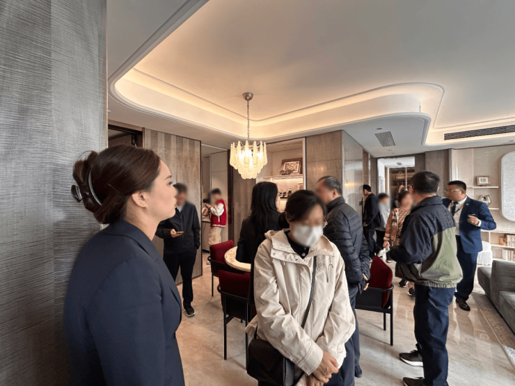 从私属公园到玖系高定会所,每一处场景都站满了驻足品鉴的客户。鎏金画廊前打卡留影,冷翡翠玉桥上往来不绝,洽谈区更是一座难求。有同行感慨:“很久没在内环旁见过这么热闹的实景开放了。”