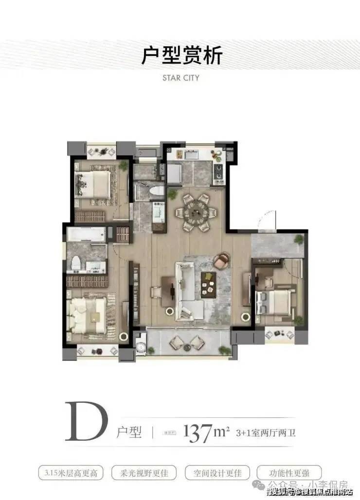 ·约137㎡户型:格局上做到了三开间朝南+南北通透,大尺度的奢阔横厅设计串联南向观景大阳台,整个公区的视野无比通透;主卧套房,保证了业主的尊崇感和私密性!