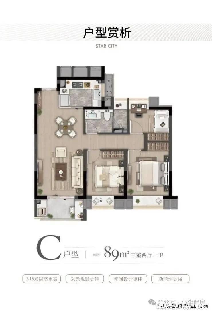 ·约89㎡户型:大虹桥范围不到90㎡的户型大部分都只做到2房,灿耀星城该面积段实现3房功能性,让自住客户一步到位,也让该产品进入二手市场后具备降维打击的优势!