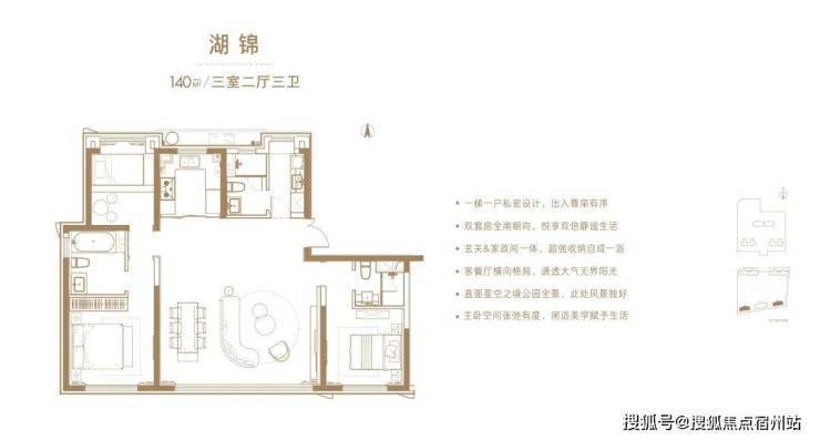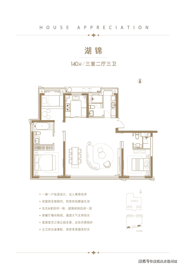 2)三个房间三个卫生间,南向双套房设计,符合高端人群的卫生要求。