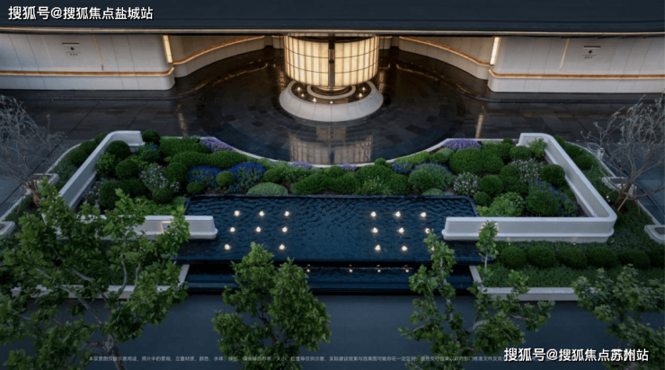 社区景观方面,项目运用室内手法室外化设计构想,将垂直景墙、悬浮观景台与叠水景观立体穿插,形成情随境转的沉浸式体验,自然元素渗透进室内,并与室内空间动态互动。