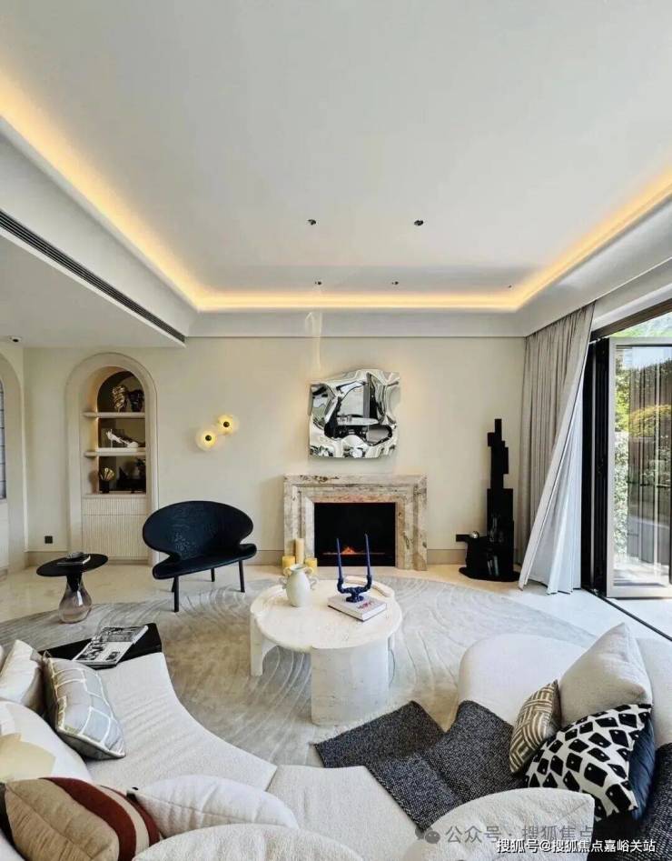 「无界空间」:客厅270度转角无柱设计,搭配落地玻璃,开阔视野将院中风景迎入日常.