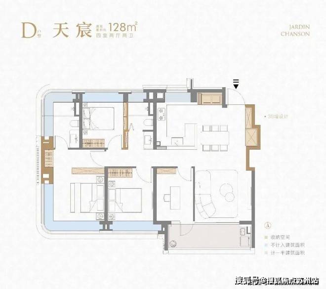 项目建面约128㎡4房户型 延续了前作3S墙的设计,保证了收纳空间的丰富性。