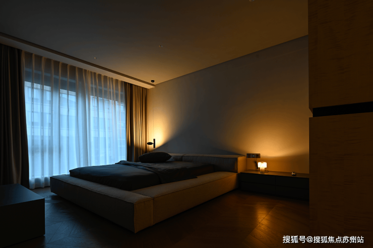从客厅行至卧室,光线也由明转暗,携手人们渐入佳境。温暖柔和的光线呈点状晕散,柔顺迂回的线条在暗影中浮现,朦胧暧昧的氛围大面积散开,为夜色中的好时光作陪衬。
