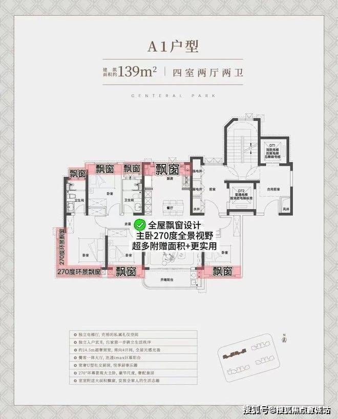 中环铂樾建面约139㎡的户型(西边套),独立电梯厅+罕见的大横厅设计,大面宽短进深,约15.05m的南向奢阔面宽,无论是采光感、尺度性都拉到了极致,享受城央豪宅级别的采光。