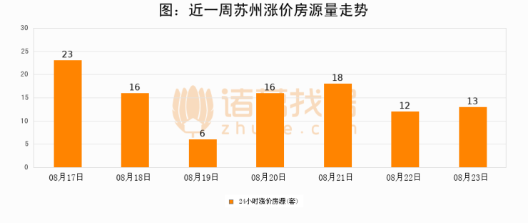 根据诸葛找房数据显示,苏州24小时涨价房源量为13套,较08月22日增加1套,环比上涨8.3%。与此同时,涨价房源占比小幅扩大,业主信心有所提升。