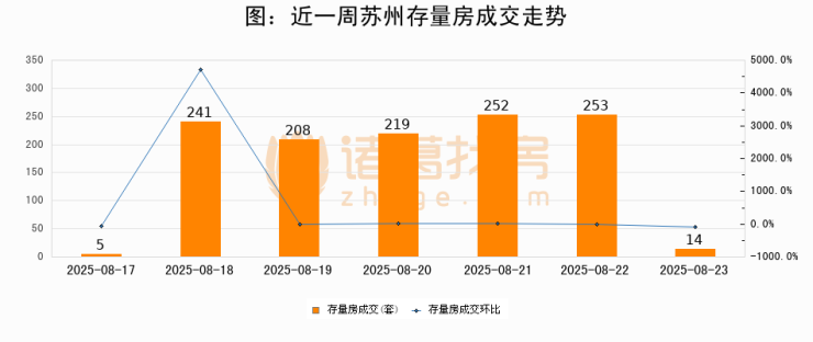 从存量房来看,2025年08月23日苏州存量房单日成交14套,比昨日减少239套,环比下降94.5%。从近一周存量房成交来看,苏州存量房日均成交套数为170套,08月23日单日成交14套,低于近一周平均水平91.8%。