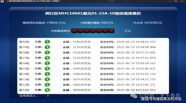6月19日,闵行1幅地块出让,地块名称为颛桥镇MHC10601单元01-22A-10地块,规划用地性质为住宅用地,出让面积4.05公顷,容积率为2。经过40轮竞拍,最终由上海保利城市发展有限公司竞得,总成交价314026万元,溢价率12.95%。