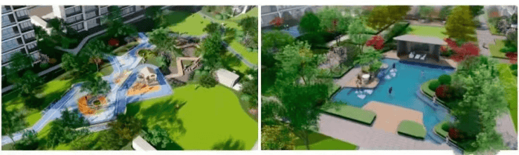 小区公共活动区,主要为不同功能的园林组团,儿童游乐区有潮汐草坪、涂鸦植物认知墙,最大的亮点是板块内唯一的儿童戏水池