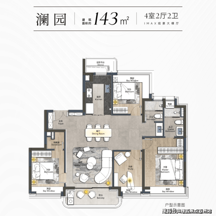 超拓设计:三开间朝南+横厅,主卧套房配置独立衣帽间及270°转角飘窗,空间利用率大大提升。