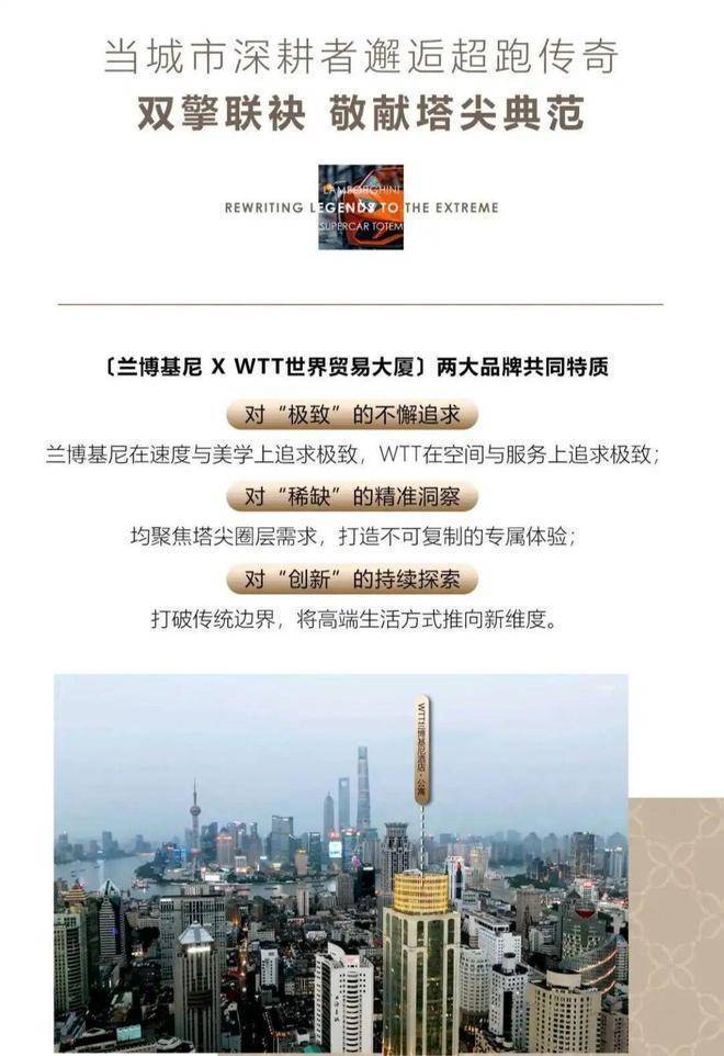 〔品牌联袂〕:兰博基尼×WTT世界贸易大厦两大品牌联袂,为全球塔尖人群打造专属的会客厅;