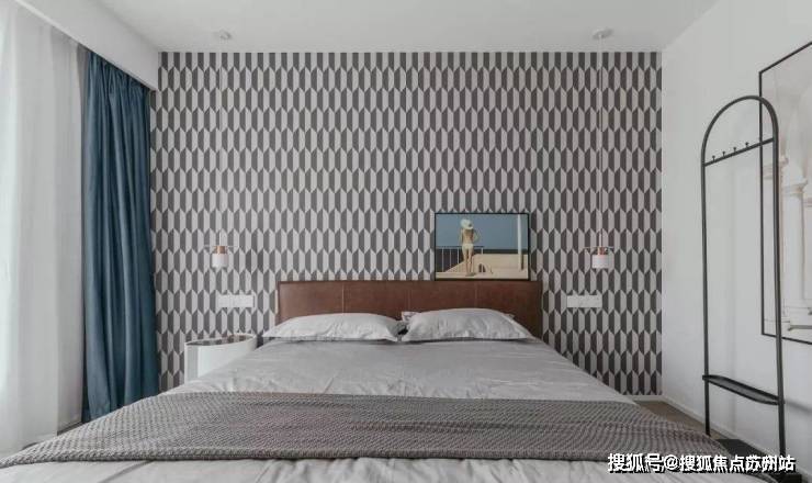 主卧木色的地板,波普纹理的背景墙,挂衣架及装饰画的搭配,灰白色的床品,整个空间色彩搭配温柔之余,尽显简洁雅致的调性。