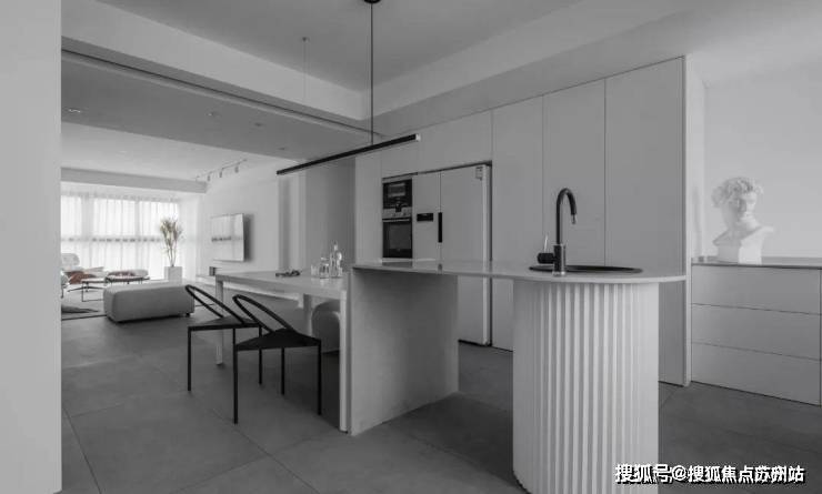 西厨与餐厅一体设计,灰色真空石的岛台,白色的餐桌线条简单,灰色的马毛瓷砖,顶部设计灯带,弱化原来梁体让其空间轻松。