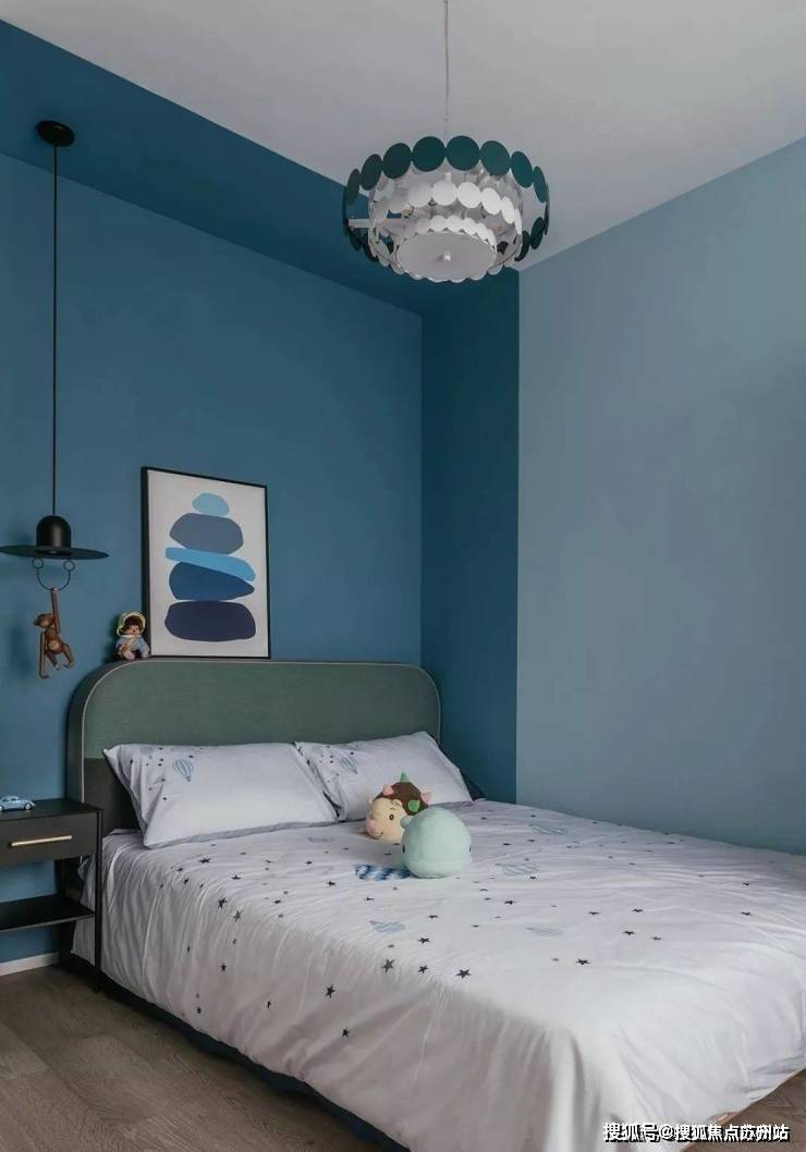 儿童房的设计趋向于孩子拥有更多的活动空间,趣味性猴子吊灯,靛蓝和土耳其蓝的结合增加睡眠的静谧感。