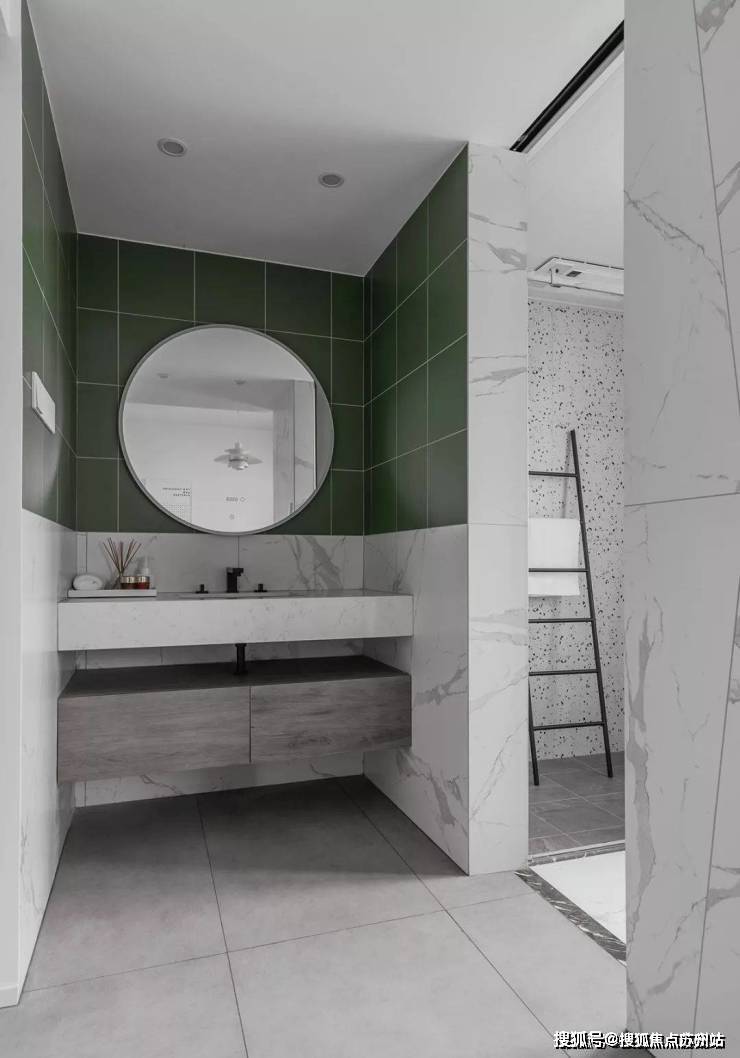 卫生间干湿分离设计,瓷砖选用海王绿搭配爵士白,悬挂式洗浴盆,带入现代都市精致感的氛围。