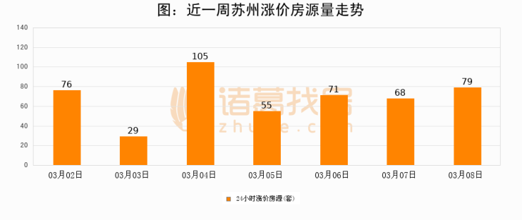 根据诸葛找房数据显示,苏州24小时涨价房源量为79套,较03月07日增加11套,环比上涨16.2%。与此同时,涨价房源占比小幅扩大,业主信心有所提升。
