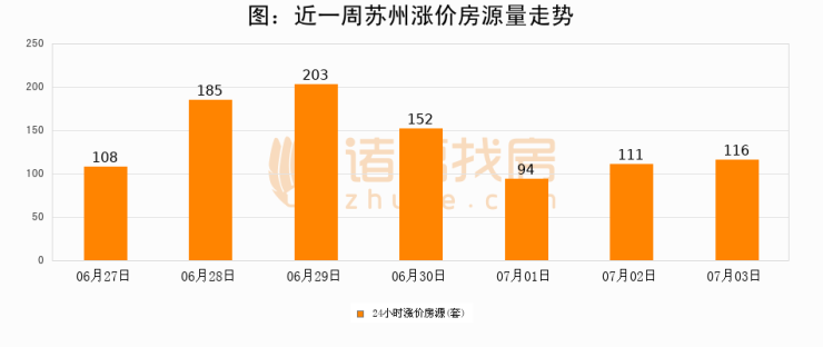 根据诸葛找房数据显示,苏州24小时涨价房源量为116套,较07月02日增加5套,环比上涨4.5%。与此同时,涨价房源占比小幅扩大,业主信心有所提升。