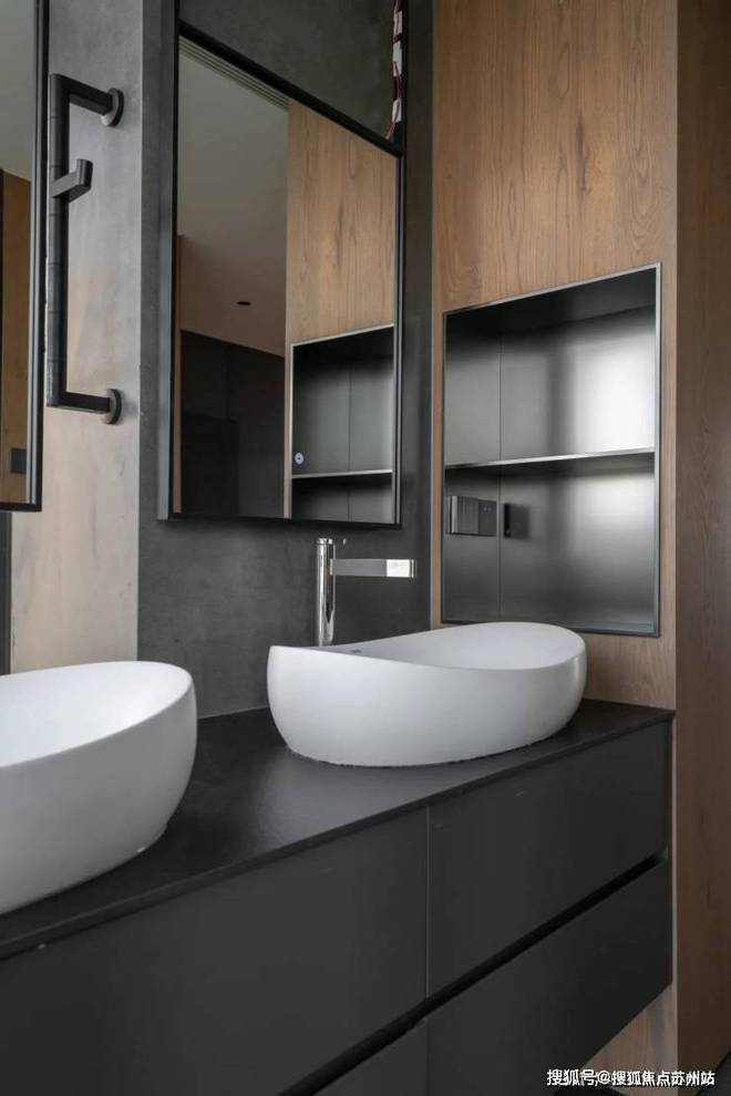 龙湖山河颂售楼处营销中心:400-8828-814龙湖山河颂售楼处电话/地址☎:400-882-8814(开发商热线)卫生间台面延续了深灰色,相同颜色的金属壁龛质感满满,内部预留了插座方便各种小电器的使用。