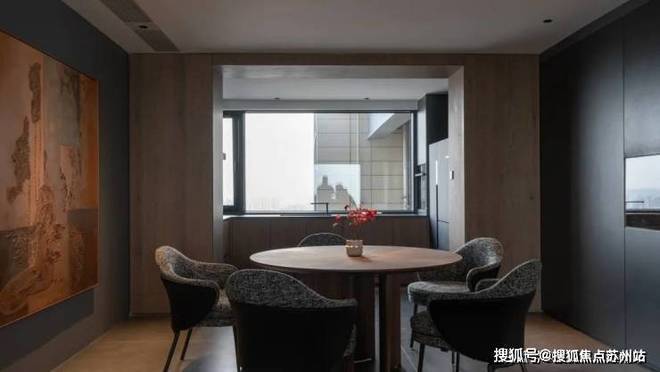 原木材质的圆桌,深色木纹与家中的暗黑色调相得益彰。每天傍晚坐在这里用餐时,还能有机会欣赏到客厅窗外“长河落日圆”的美景。