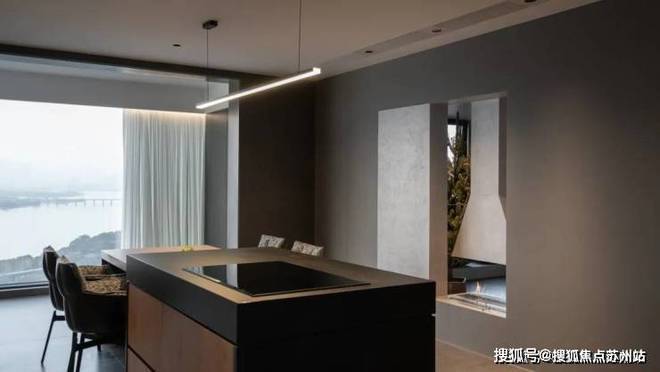 围绕着岛台餐桌的西厨区,不但可以直接欣赏到从客厅延展而来的江景,书房墙体和柜体之间留出一部分距离,也能窥见玻璃植物房的景观。