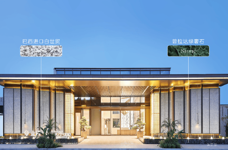 从园林到立面,处处体现精工细作。 汲取宝格丽美学理念,甄选世界名贵花木。 入口地面采用巴西进口白世贸、普拉达绿等十余种品质奢石铺装。 用奢材奢艺,构筑充满艺术感的生活场域。