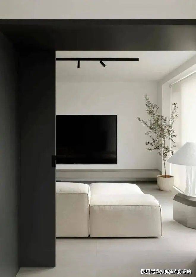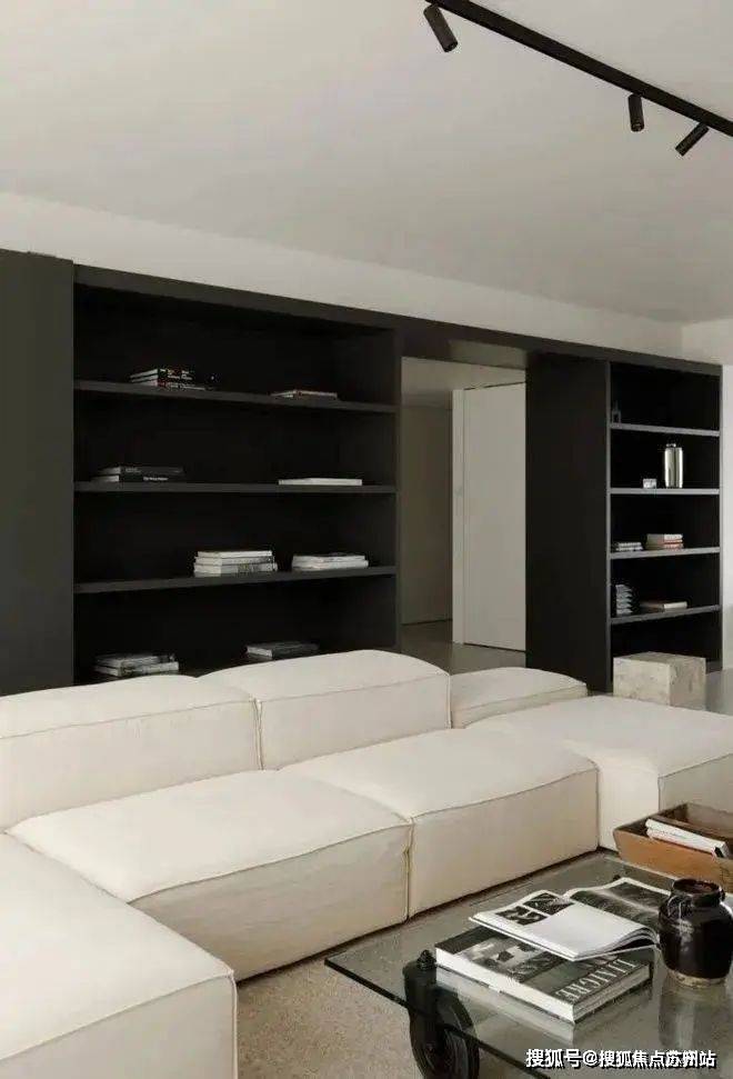 客厅沙发背后的深灰色烤漆书墙背后是书房的所在,以一扇2m长的深灰色烤漆移门控制开合,形成,形成“1+1”的可变空间组合,既满足了收纳需求,又实现了社交空间与私人空间的转换。