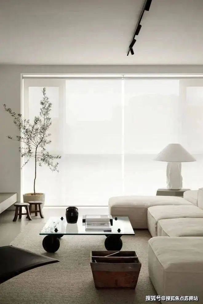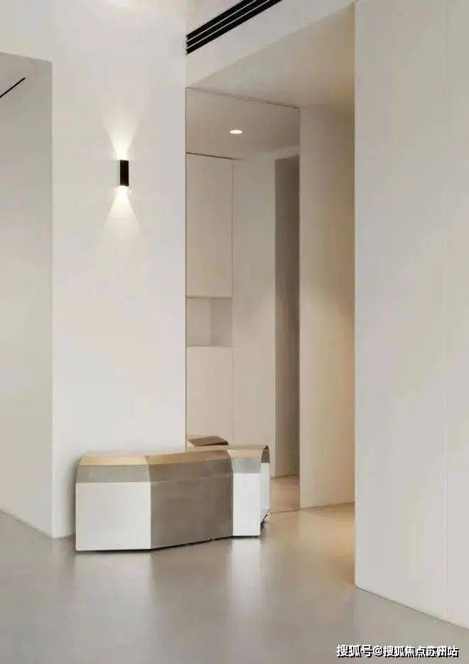 四白落地的墙面,浅灰色混凝土地坪和无主灯设计,让空间更加简洁干净的同时,也为屋主希望‘家’和‘画廊’空间的结合成为可能。