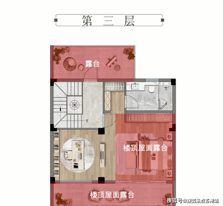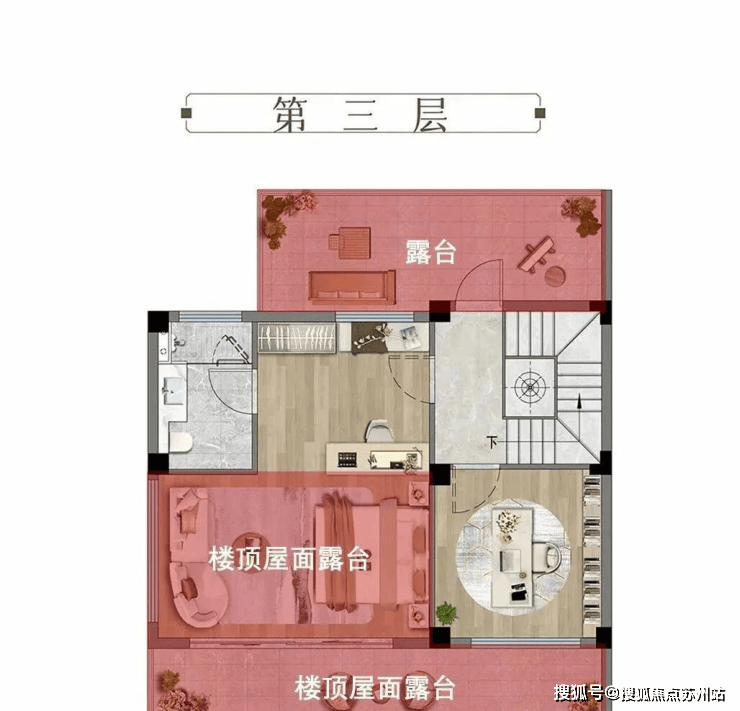 三层,整层套房设计。约27㎡的南北双向空中别院,可以演绎更多的生活可能,一把躺椅,几杯清茶,感受晚霞余晖、感受微风吹拂,诗情画意的生活在此具象化。