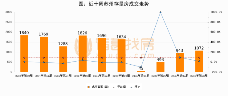 存量房方面,第08周苏州存量房成交1072套,较上周增加129套,环比上涨13.7%。从近十周成交走势来看,周均成交套数为1260套,本周低于平均水平14.9%。