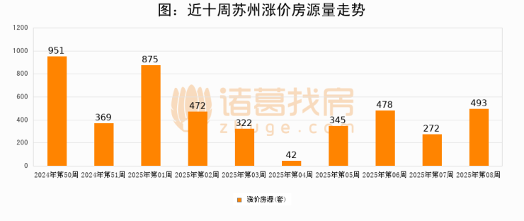 从调价房源来看,第8周苏州涨价房源493套,较上周上涨81.2%。与此同时,8周涨价房源占比提升0.24个百分点,业主信心持续恢复。