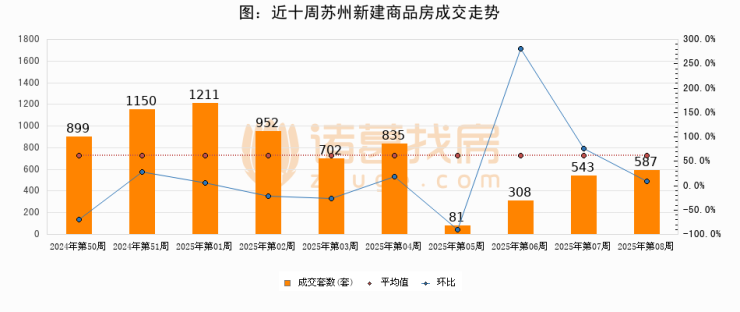 进入2025年第08周(02月17日-02月23日),苏州新建商品房成交587套,较上周增加44套,环比上涨8.1%