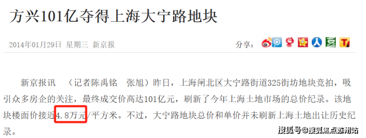 2014年1月土拍,上海闸北大宁地块出让,最终被金茂拿下,楼板价接近4.8万一平,甚至超越了周边的二手房价。