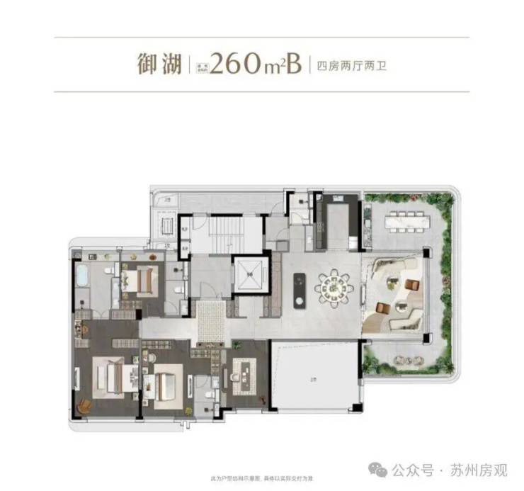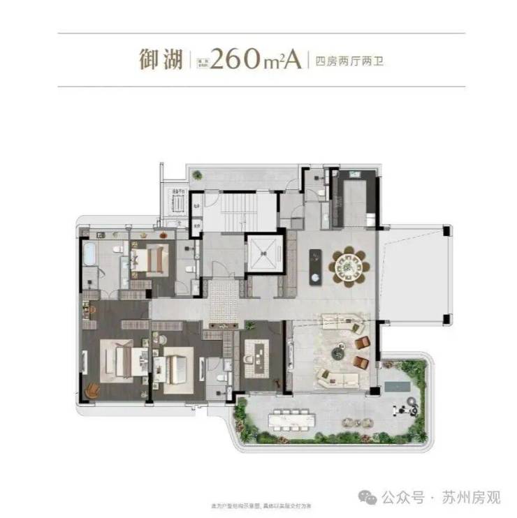 其中,洋房为四代宅作品,公区留有架空层设计,实现观景走廊、花艺展示空间、下午茶沙发区、户外休息区等4大活动空间。