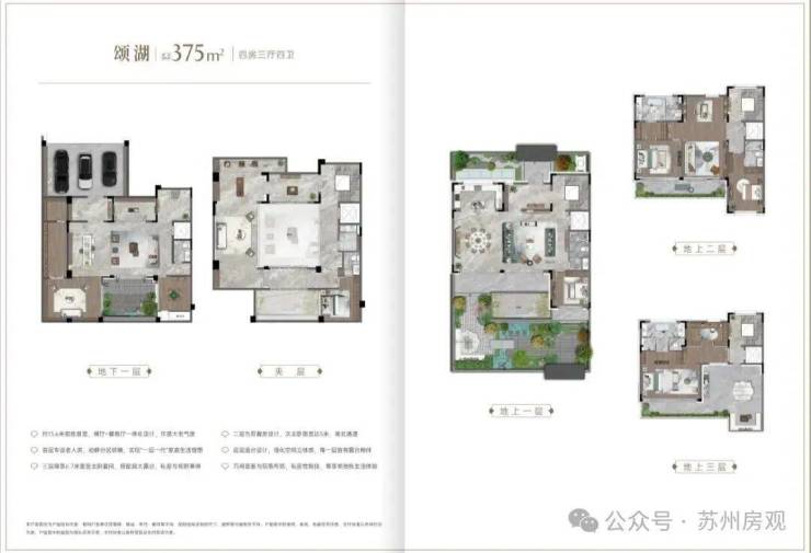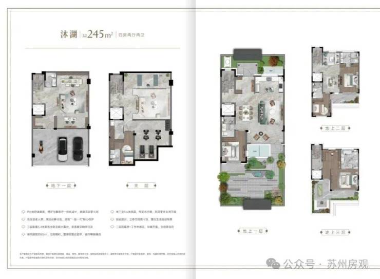 户型方面,合院,面积段为建面约245/287/295/365m²,3层设计,层高3.1-3.5米,户户配备独立庭院,深灰铝板+金色金属板立面,融合宋式建筑风骨与现代质感。