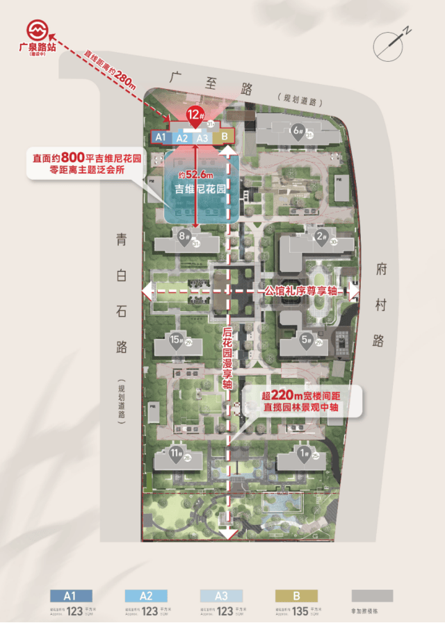 1、楼间距更开阔,离地铁更近:它的南北楼间距超过了52.6米,比首开的8号楼栋更宽敞。最关键的是,它几乎是离在建的20号线广泉路站最近的楼栋之一。等小区交付,地铁也差不多通了,这种“无缝衔接”的便利度,懂得都懂。