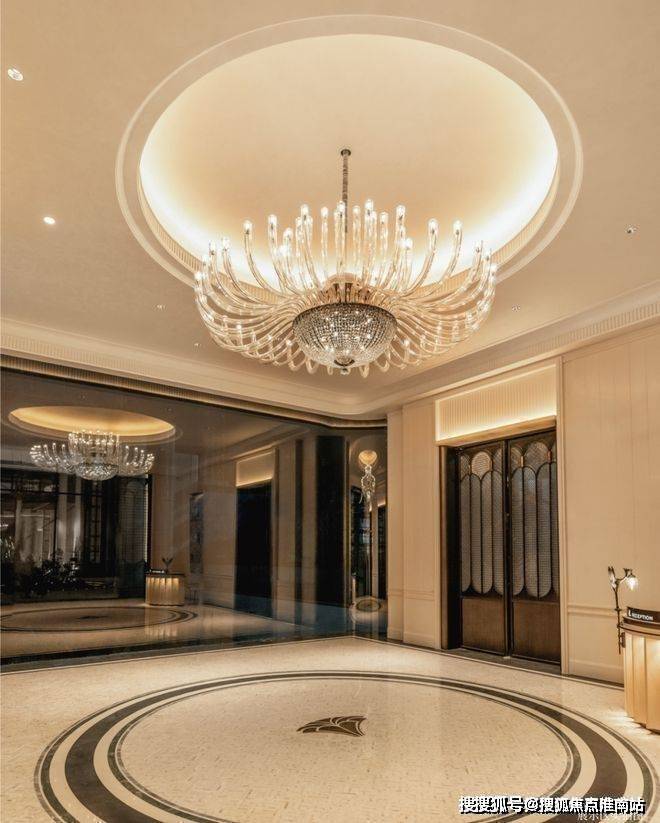 预接待厅门头源于招商局出资创办的原南洋公学(现在上海交大)三段式建筑造型.优美、经典的软装风格定制无不彰显着生活的品味,天花板定制了细腻入微的deco设计细节,地面瓷砖采用威尼斯白与爵士白石材拼花设计,纯人工铺装保证花纹的奢华质感,壁面装饰的水品灯,选用高规格的E9级进口水晶制作,真正将海派设计融入生活.