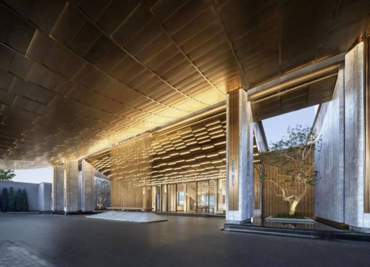 大面积的LOW-E玻璃立面链接室内外界限,横向线条与深挑檐口提炼自传统符号,却呈现出现代极简的形态。同时项目甄选雅灰鎏金为主色调,对挑檐、勾栏、歇山顶等传统建筑元素进行现代转译。