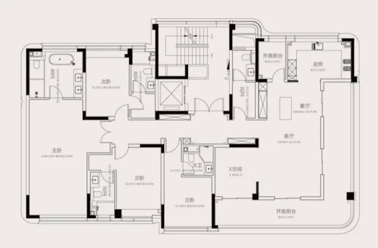 户型本身亮点很多。比如南向开间达22.4米,五开间朝南,采光面充足。公区采用了经典的LDKG设计,餐客厅面积约66㎡,敞亮奢阔。客厅旁边还有一个X百变空间,可做房间,也可拆除墙体进一步增加客厅尺度感。270°环形开敞式大阳台,也是该户型一大亮点。阳台面积约33㎡,一半为赠送面积。后期可与室内空间完美打通,在两面巨幅落地窗的加持下,公区的空间感和视野通透性将变得非常强烈。而且,窗外的景观资源也很丰富。除了可以欣赏园内打造的四季风景,园区的东方之门、IFS等城市风景,都在眼下。在房间布局上,这款户型也充分体现了“平权性”。四间卧室都是套房设计,全部带有独卫,保证业主起居私密性。主卧开间约4.2米、南次卧开间分别是约5.1米和3.5米;北次卧约5米开间...每一间卧室都极其开阔。