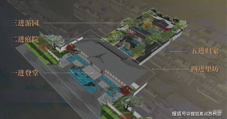 江南里师法《千里江山图》、《溪山行旅图》、《四景山水图》等经典宋画布局,敬呈登堂、庭院、游园、里坊、归家五进礼序,打造吴江首座约240㎡下沉式庭院,规划“两坊四里九邻十二巷”格局,铺展可赏、可游、可憩的诗画长卷。