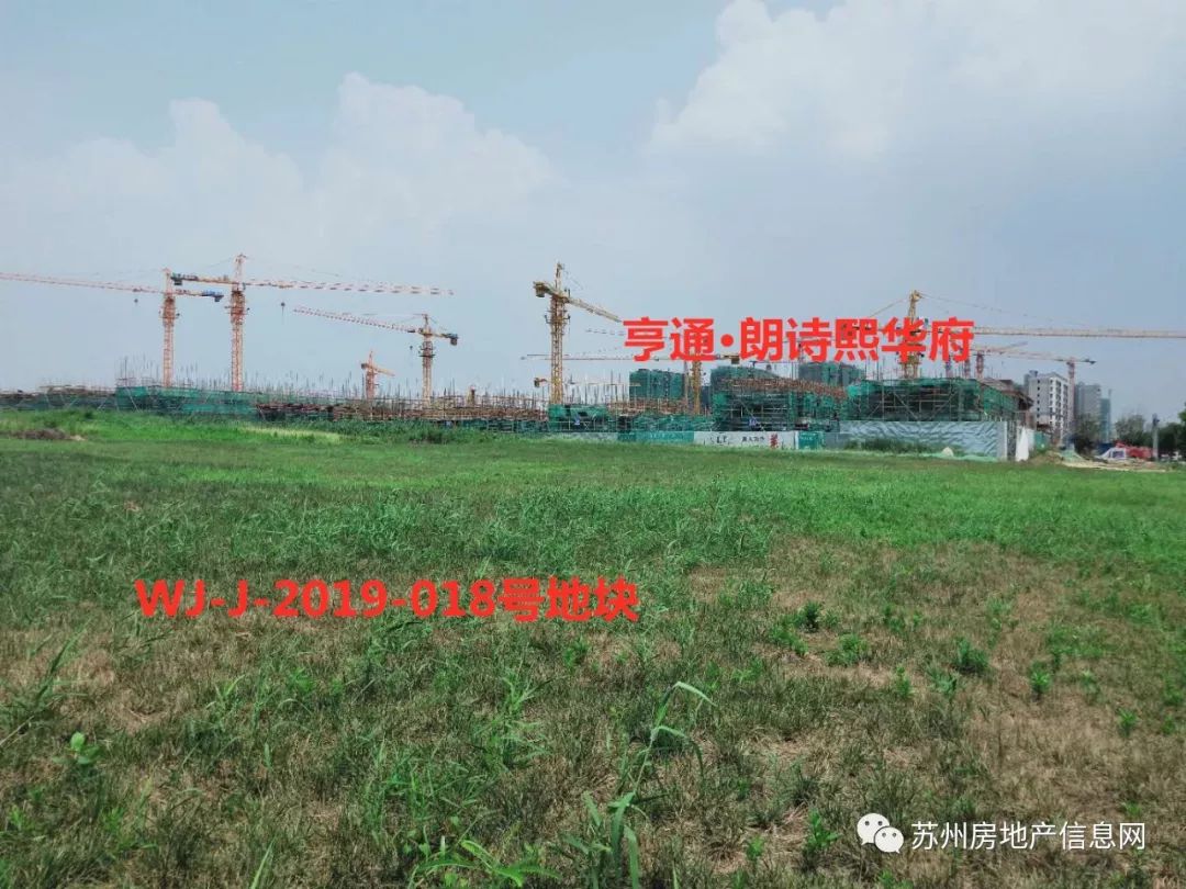 目前地块现状,从现场可以清楚的看到,WJ-J-2019-018号地块与WJ-J-2019-017号地块紧密相连,两宗地块的东侧紧邻当前吴江“地王”项目——亨通·朗诗熙华府。(2017年11月28日,亨通地产以总价14亿元拿下WJ-J-2017-039地块,成交楼面价18156元/㎡,溢价率45.45%。)