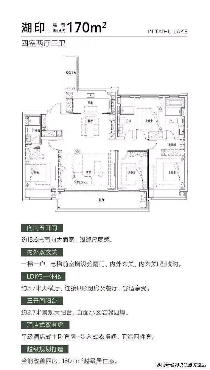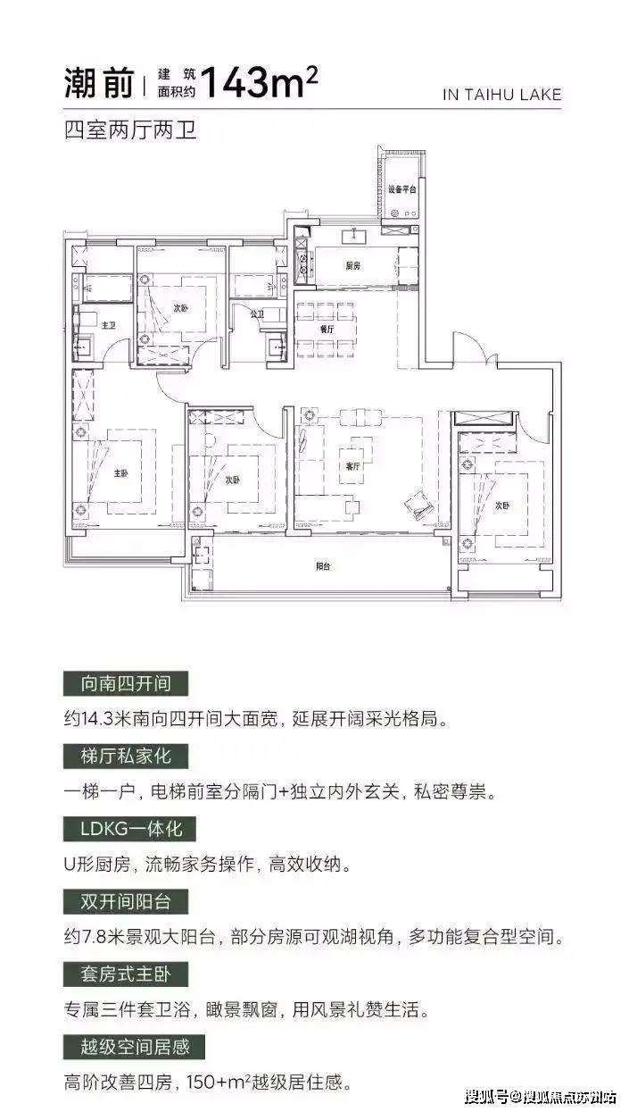 约14.3米南向四开间,全屏式采光面让光线参与空间的设计,阳光与清风于此成为生活的主角;约7.8米双联跑道式阳台,270°宽屏瞰湖视野,湖湾浩瀚与园林森境尽揽于眼前,建筑与自然的边界消弭于无形;创新的LDKG一体化设计,让餐客厅与厨房阳台无界相连,窗外万千风景徜徉流动于室内;酒店式星级主卧套房,私享全景飘窗、步入式衣帽间、独立卫浴,科学的功能区划分、人性化的精装细节,让精致的起居感受流淌于每个空间细节。