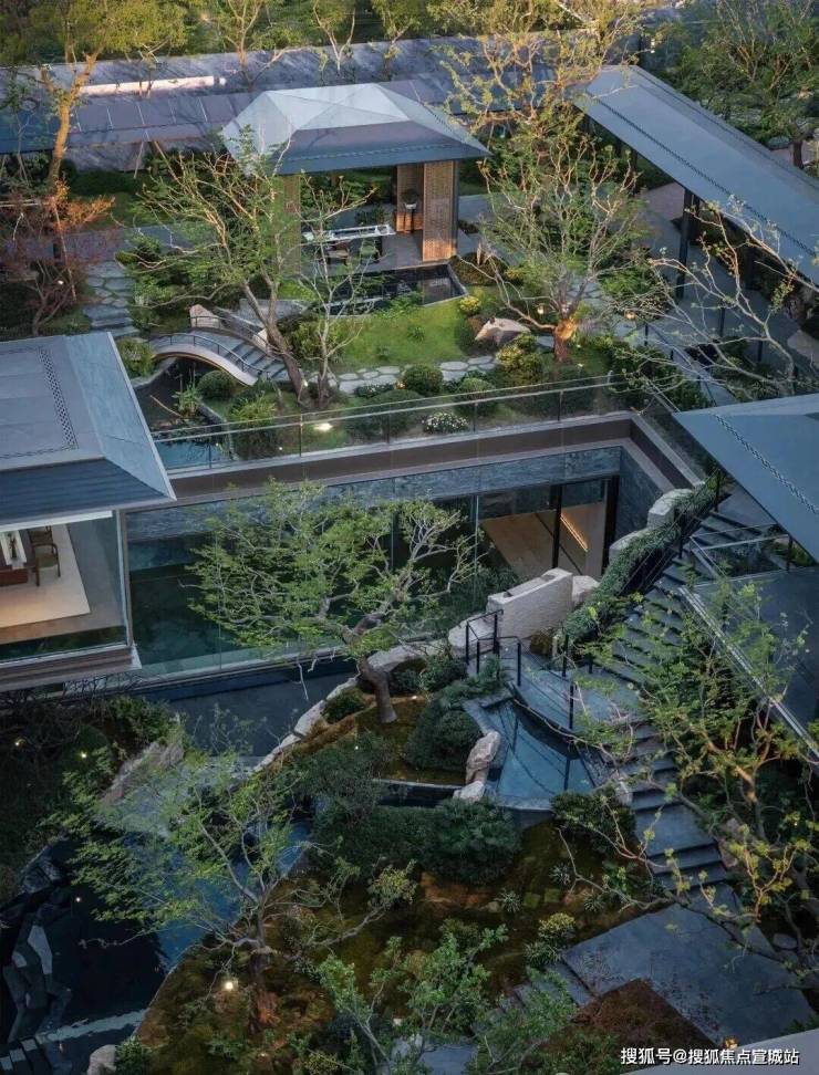项目自南向北刻画出一条蜿蜒曲折的中轴景观带,遍布下沉庭院、绿植、叠瀑、溪水和小桥.