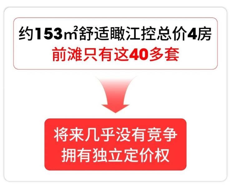 另外,前滩新房开发已近尾声,这类“舒适瞰江控总价4房”只有前滩滨江道有,且只有这40多套,入手后在整个前滩几乎无竞品,未来将掌握更强的定价权。